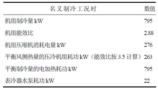 該測試系統在測試時,運用表冷器能夠使得冷熱量自平衡,最大限度地利用風冷冷(熱)水機組使用側的冷量與熱源側的熱量交換,熱源側的熱量被使用側的冷量平衡后剩余的只有壓縮機的功率這部分熱量需要通過冷卻設備散去,并不需要消耗大量的能量來單獨平衡使用側產生的冷量和熱源側產生的熱量。而且風冷冷(熱)水機組的能效比越高,同等制冷量下,需要測試系統散去的壓縮機功率也就越少,測試系統也越節能。以800kW風冷冷(熱)水機組制冷為例,表冷器的運用對測試系統的耗能比較見表1。