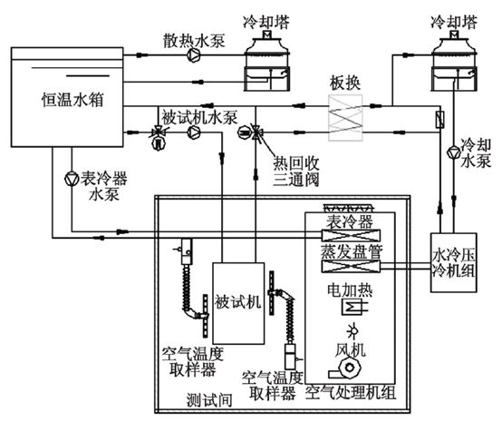 風冷冷()水機組測試時,通過空氣處理機組將風冷冷()水機組風側產生的冷熱量進行處理,使得測試間內的溫濕度達到國標要求的值。而機組產生的冷熱水回到水箱后,通過水箱配置的冷熱源進行平衡,從而達到機組在國標要求的工況下穩定運行,采集系統將所有的測點采集,通過電腦內專業計算軟件進行計算輸出實驗報告。