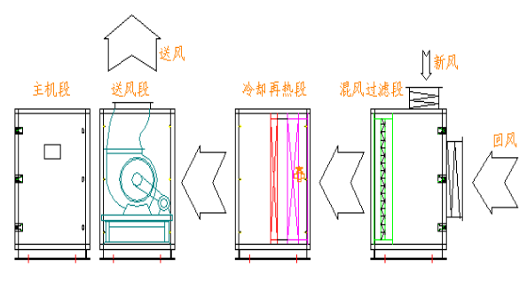 混風(fēng)過濾段:使新風(fēng)和回風(fēng)進(jìn)行混合,并對混合空氣進(jìn)行過濾處理,主要包括新風(fēng)法蘭、回風(fēng)法蘭和初效過濾器。